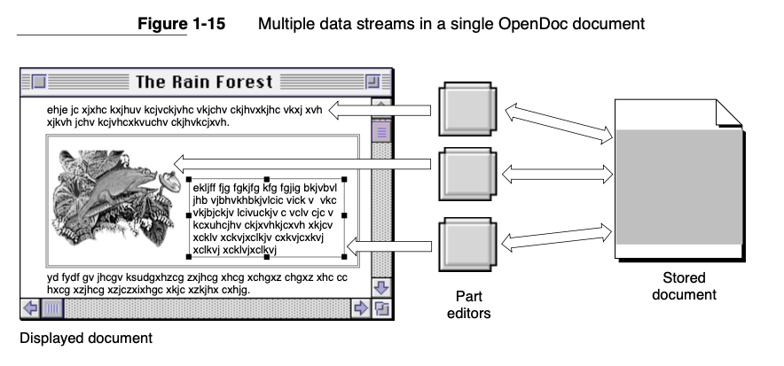 One set of ideas comes from compound-document systems, like OpenDoc and OLE. These let authors compose documents out of multiple kinds of media embedded in each other. For instance, a text document might host an embedded diagram, which can in turn host a table of data. Selecting one of these parts opens up an editor in-place, with no flipping back and forth between windows or digging through the file system required. These systems are open-ended; developers can introduce new kinds of media, as well as new, alternative editors for existing media types.