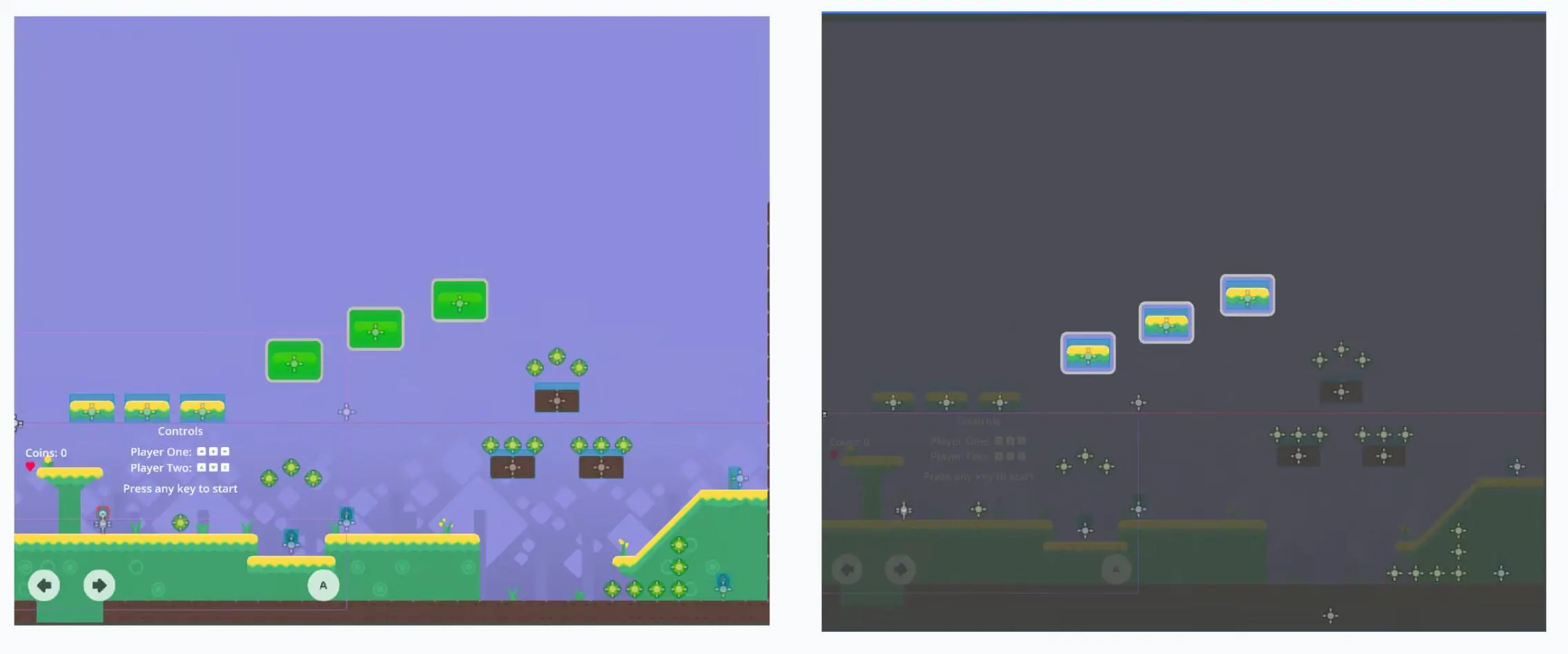 Visualizing diffs within a visual editor, like a game editor viewport, is a tricky affair — you have no idea what the art style of the game will be, so simply highlighting diffs in green is unlikely to work in many cases. Our current approach is to grey-out all non-highlighted elements, giving the changed objects stark contrast with their surroundings.
