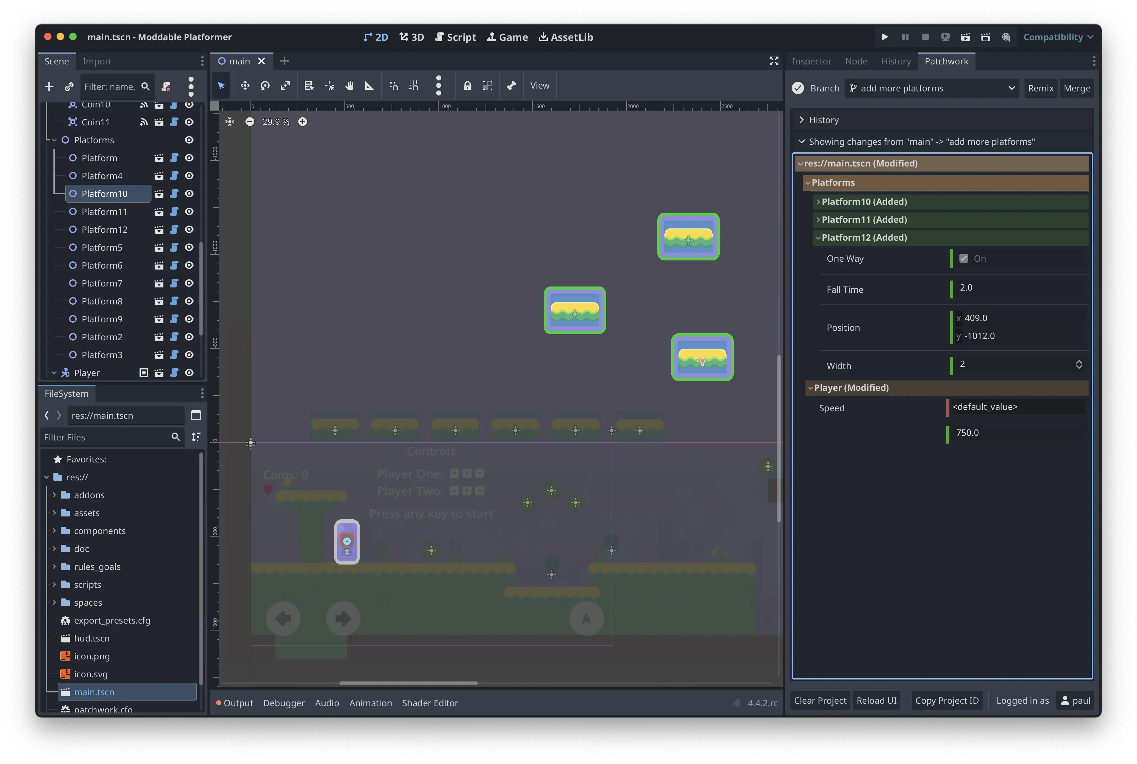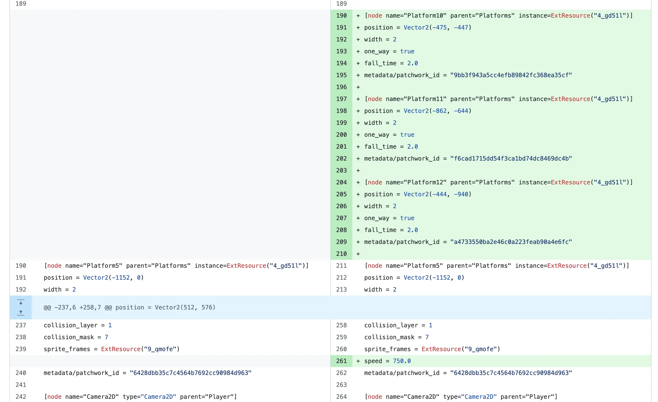 Games built with Godot are made up of “scenes”, which are stored as text files to allow version control with Git and other typical version control tools. A scene is composed of nodes—the engine’s smallest building blocks—arranged into trees. Each node has spatial properties (position, rotation, scale) and a place in the hierarchy. Here’s what a change to a scene file looks like in Git.