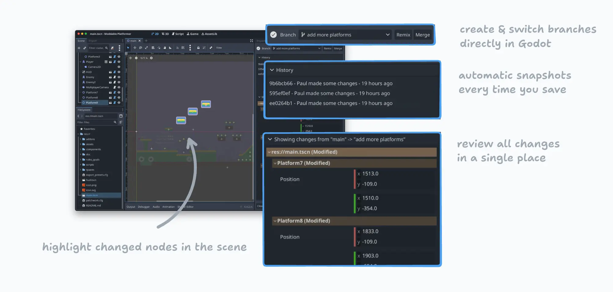 Godot has become popular with indie developers and newcomers to game programming as an accessible option for building games. However, despite its strengths, Godot lacks robust tools for collaboration. Currently, if you want to work with other people on a Godot project, your only real option is Git which has a steep learning curve: it’s a separate command-line tool designed for code, other assets like scene files or images are not very well supported, making collaboration frustrating and error-prone.