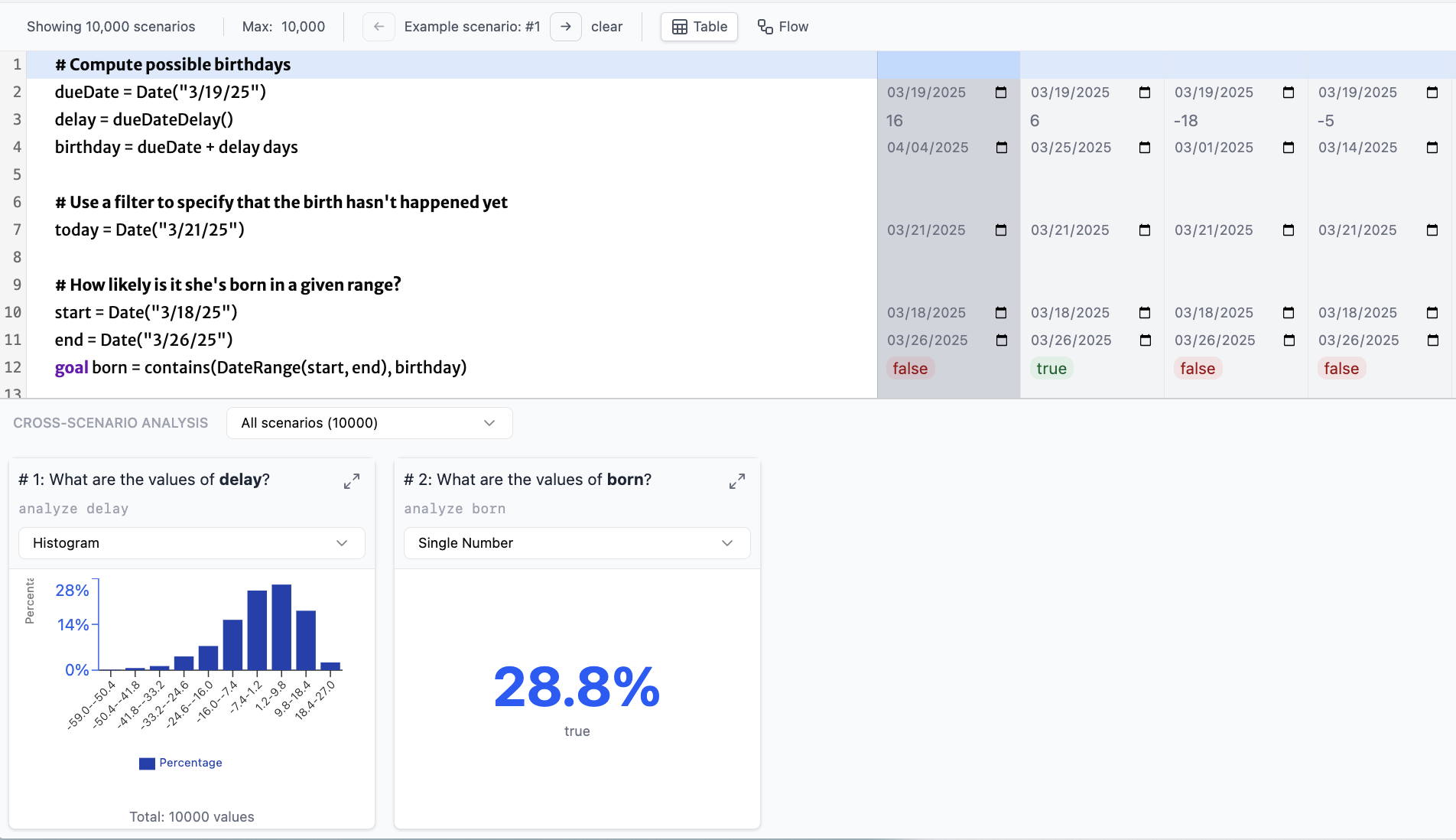 Instead of evaluating every possible scenario, our v2 prototype selects thousands of sample scenarios (by picking a value at random from each amb), then evaluates the formulas in each of these scenarios. The idea is that by analyzing a large set of sample scenarios, the user can build a pretty good understanding of a huge (potentially infinite!) space of possibilities.