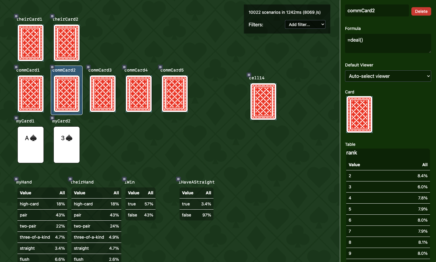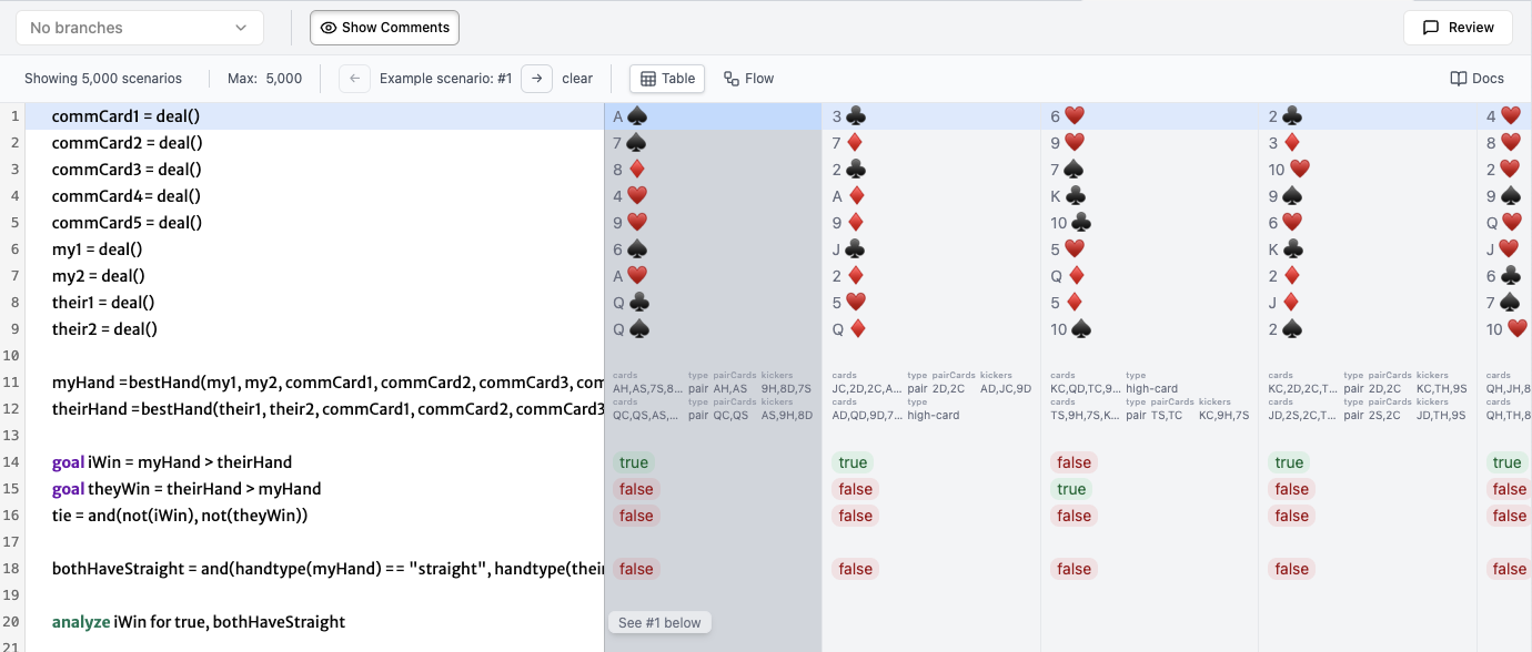 Based on initial results, we think this view holds promise because it makes it easier to see the entire contents of individual scenarios column-wise, making it much easier to debug and understand certain simulations. For example, when viewing the results of a poker simulation, each column represents a single hand.
