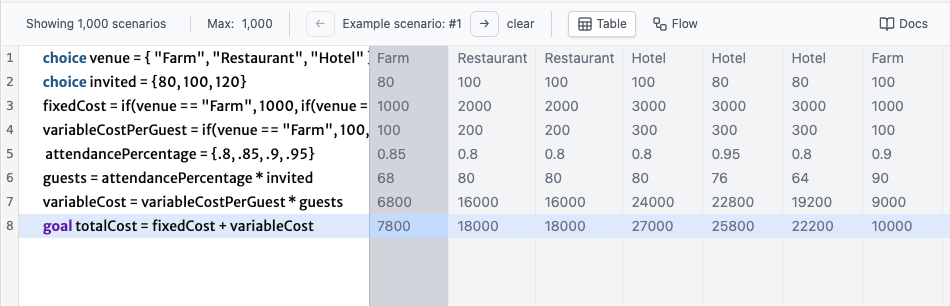 To improve on the aforementioned drawbacks of our v1 prototype, we are exploring a new “live document” form factor for Ambsheet that replaces the spreadsheet grid with a text field for the program, accompanied by a table view where each column represents a scenario. For example, the wedding example from above looks like this in the document form: