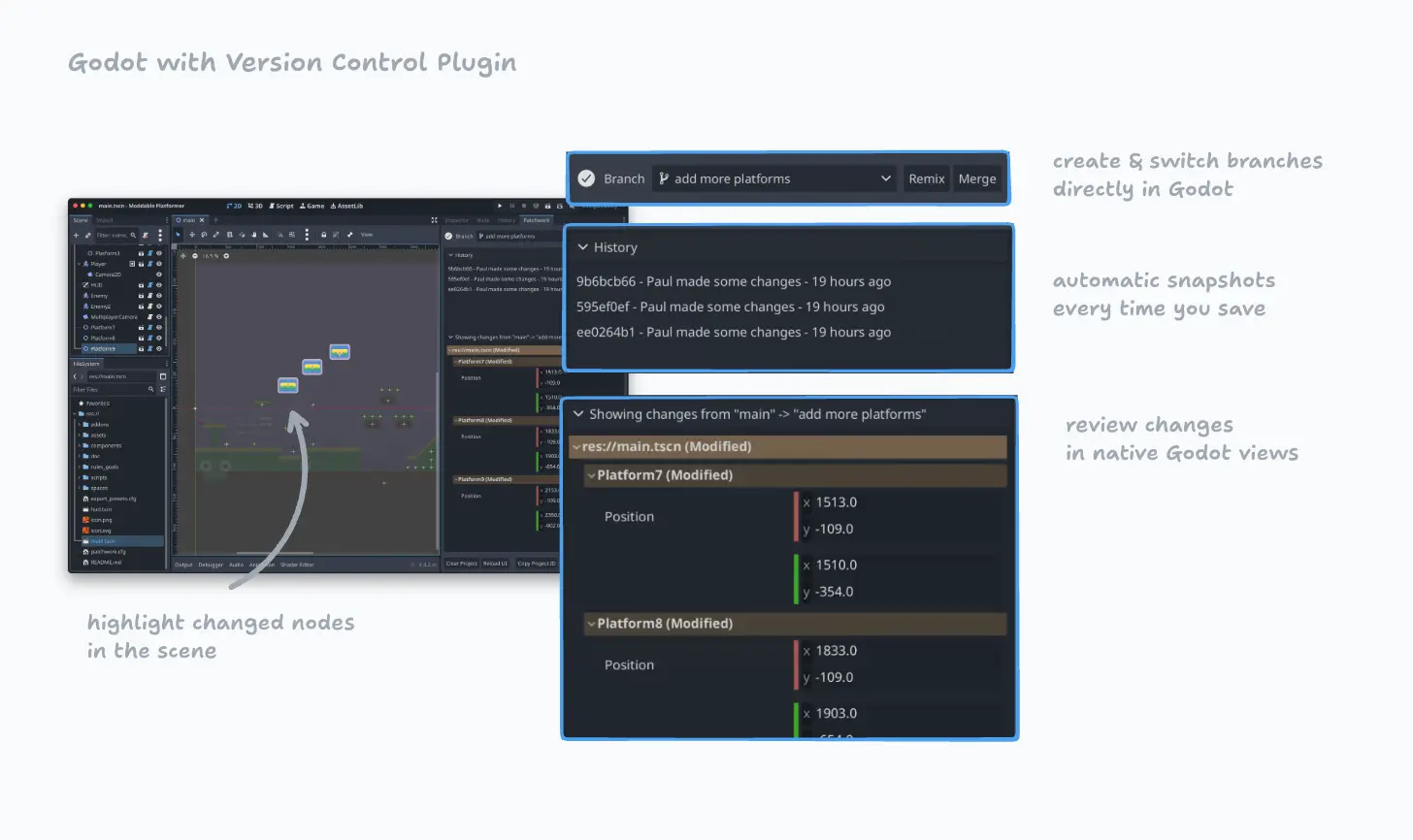 Instead, they wanted something more approachable, like the version control tools we’ve built with Patchwork. We were excited by the opportunity to expand our work on universal version control to games, and together we are creating a collaboration plugin that runs on top of a forked version of the Godot editor: