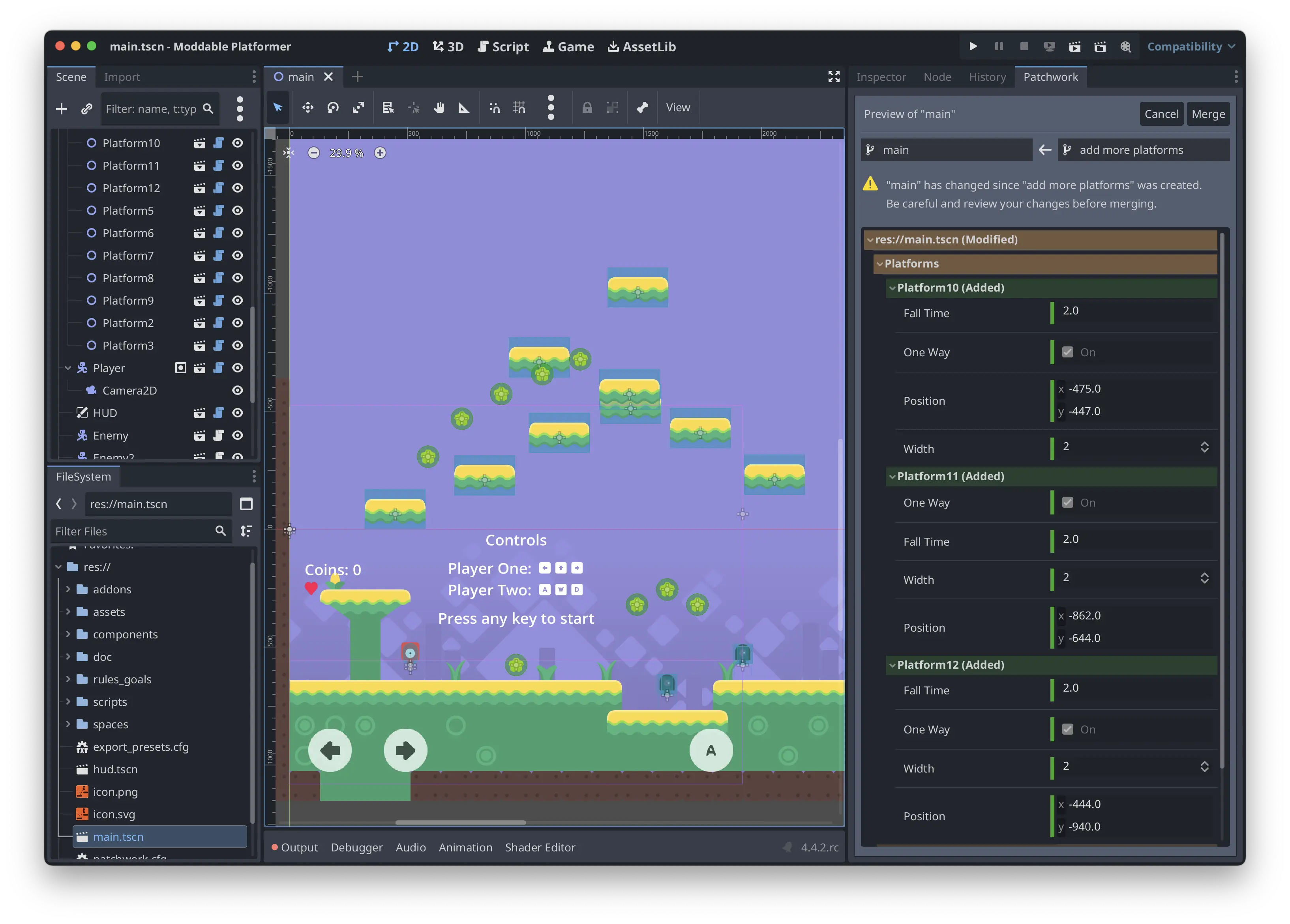 When using Git with Godot, it’s unfortunately easy to corrupt scene files when merging, rendering them unable to load. We’ve heard that this leads game developers to isolate their work to avoid conflicts — one developer works on assets, another on layout — instead of collaborating freely. Since our plugin was designed to work with the proper structure of scene files, we can guarantee that you always get a loadable scene when merging. This doesn’t mean that all changes can be combined automatically — conflicts are still possible, as we’ll see in a moment. But we believe it’s better to have a project you can open and work on within the editor than a project that won’t open until you fix a bunch of conflicts in the abstract text representation.