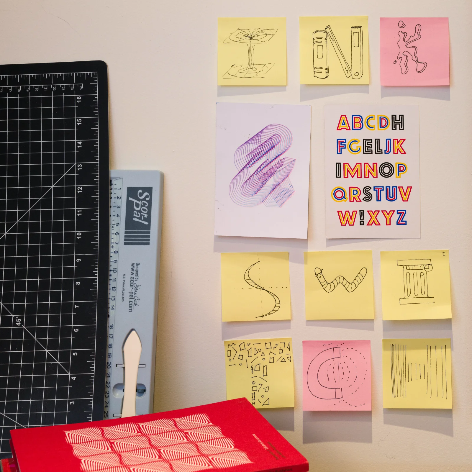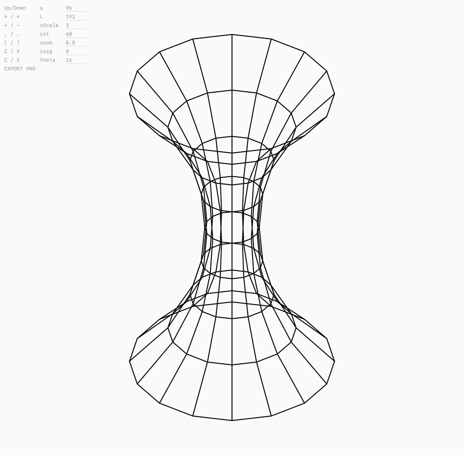 Post-it notes began to fill my wall: I-N-K-&-S-W-I-T-C-H. A catenoid for I, an inky K, a sine wave for S, maybe a bookworm for W. I had enough concept to bring the catenoid into vector drawing software, and ten seconds into pulling ellipses around with anchor points, I asked: why am I doing this by hand? A computer is so good at drawing that kind of form. What would be more interesting than a static image was a tool, one that let you tune the density, the rotation, the position, the number of splines. A catenoid as a visualization, or print-ready for a t-shirt, or whatever it needed to be. That was the moment the idea formed: a typographic specimen of small machines. Letters that are tools.