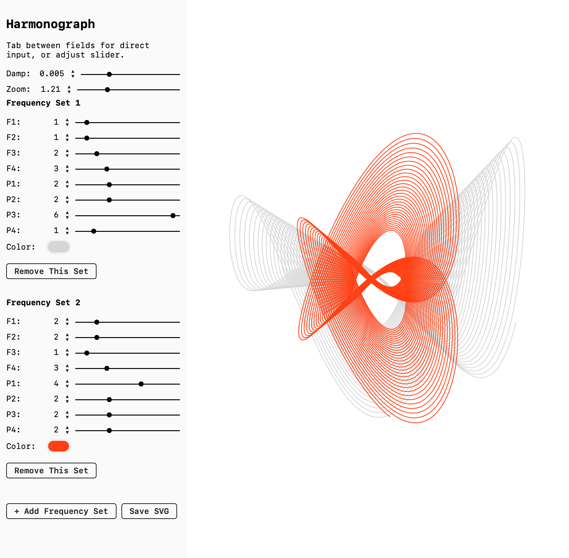 In October 2024, members of the Lab visited John Underkoffler and Andy Milburn’s studio in Los Angeles. Andy had a harmonograph set up next to a copy of my personal favorite, Quadrivium, the Wooden Books compendium that includes Anthony Ashton’s Harmonograph. A month later I started building one in code.